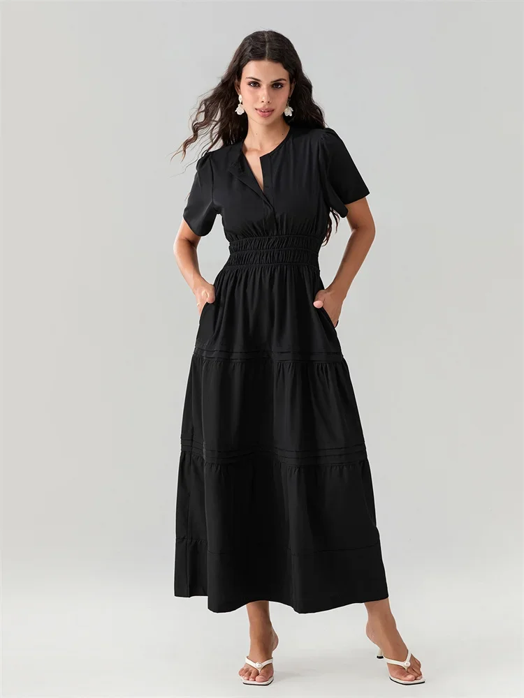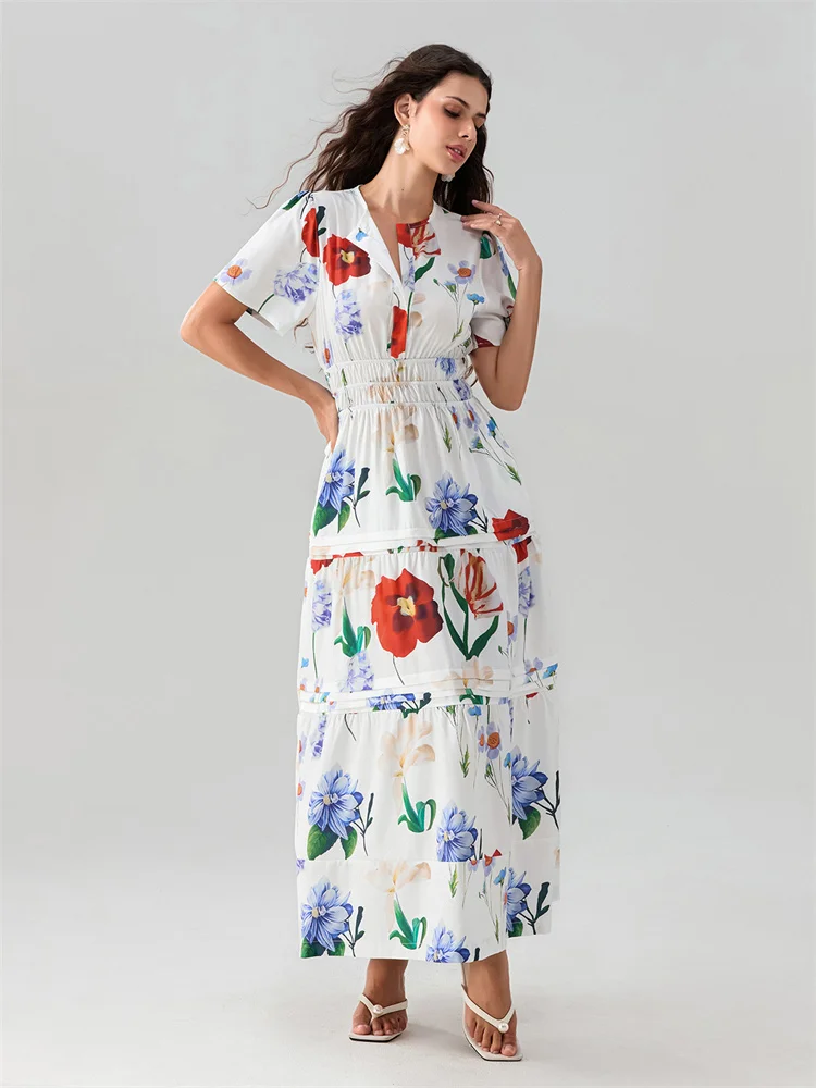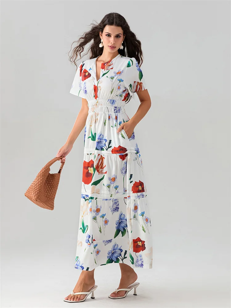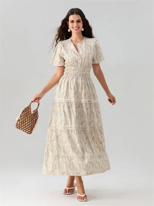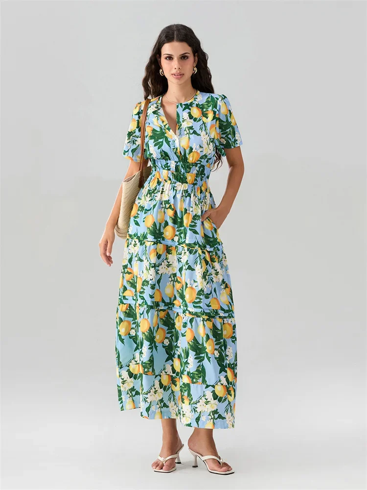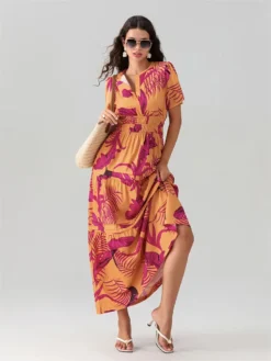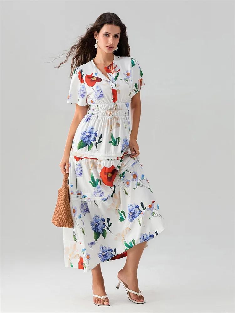 Women Print Long Dress Smocked Waist Button V Neck Short Sleeve Ruffle Hem Flowy Dresses Summer Holiday Casual Loose Dresses