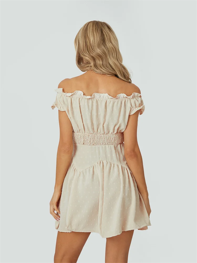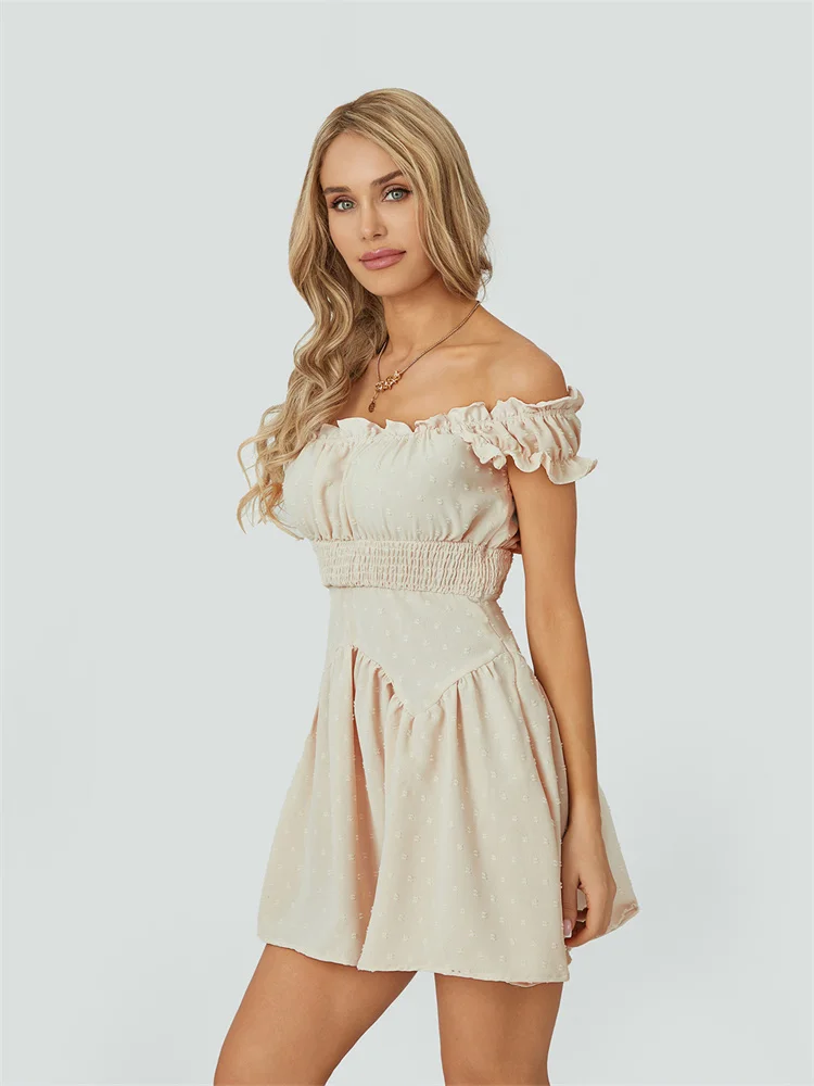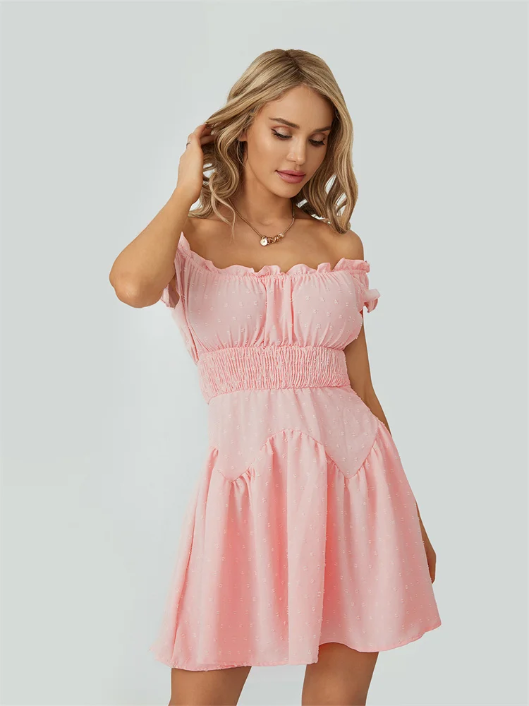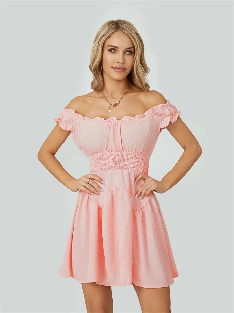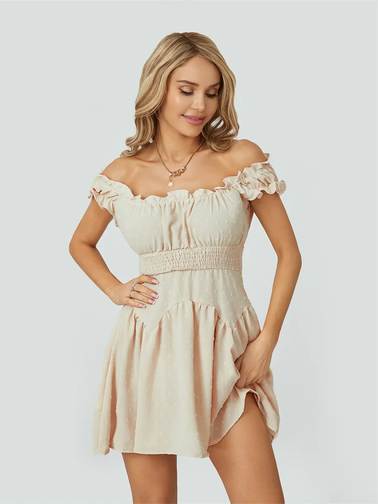 Women Summer Short Dress, Solid Color Ruched Bust Boat Neck Off Shoulder Puff Sleeve A-Line for Ladies