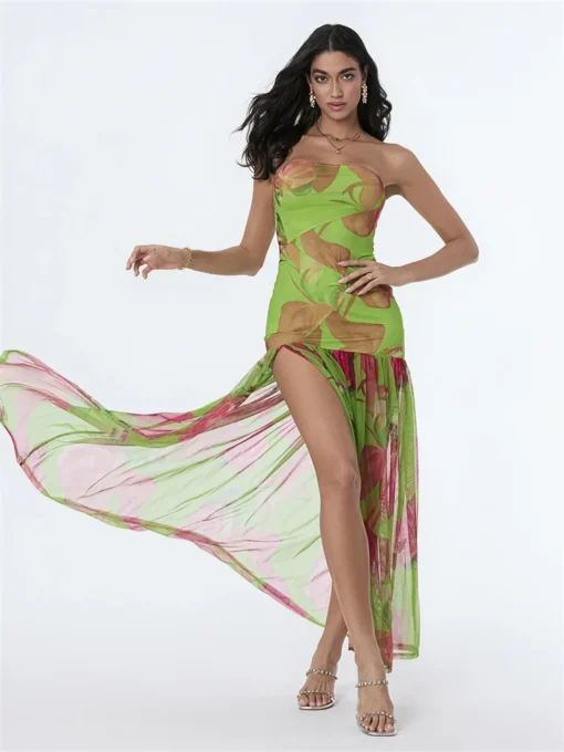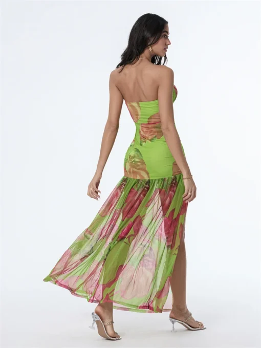 Women’s Tube Top Dress Slim Strapless Backless Mesh Patchwork Tropical Leopard Print High Slit Long Dress for Party Club Night